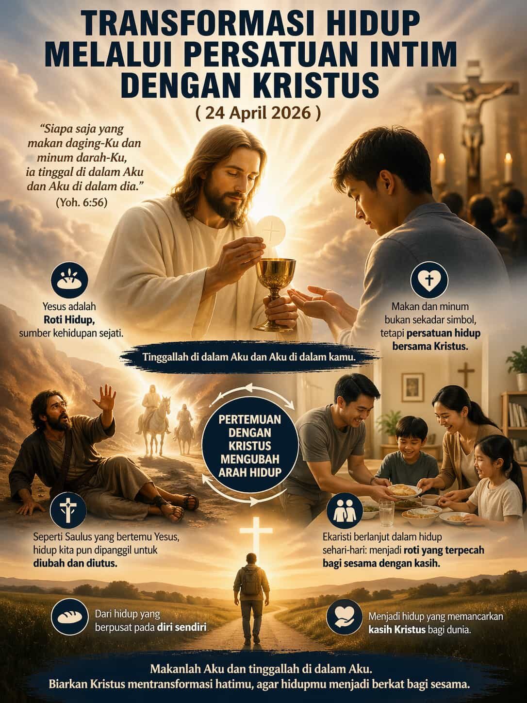 Hari ini, Tuhan mengundang kita untuk tidak sekadar “datang dan menerima,” tetapi untuk sungguh “tinggal di dalam Dia.” Persatuan dengan Kristus menuntut keberanian untuk diubah. Jika kita membuka hati, Ia akan membentuk kita menjadi pribadi yang baru, pribadi yang hidupnya menjadi kabar baik bagi sesama. Seperti Saulus yang menjadi Paulus, demikian pula kita dipanggil untuk mengalami transformasi: dari hidup yang berpusat pada diri sendiri menjadi hidup yang memancarkan kasih Kristus bagi dunia dan berkat bagi sesama. Kita diundang untuk “memakan” Yesus dan tinggal di dalam-Nya. Artinya, kita membiarkan diri-Nya mematahkan keegoisan kita. Kita bertobat dengan melayani pasangan atau anak tanpa menuntut penghargaan, menjadi “roti yang terpecah” bagi kebahagiaan keluarga kita.